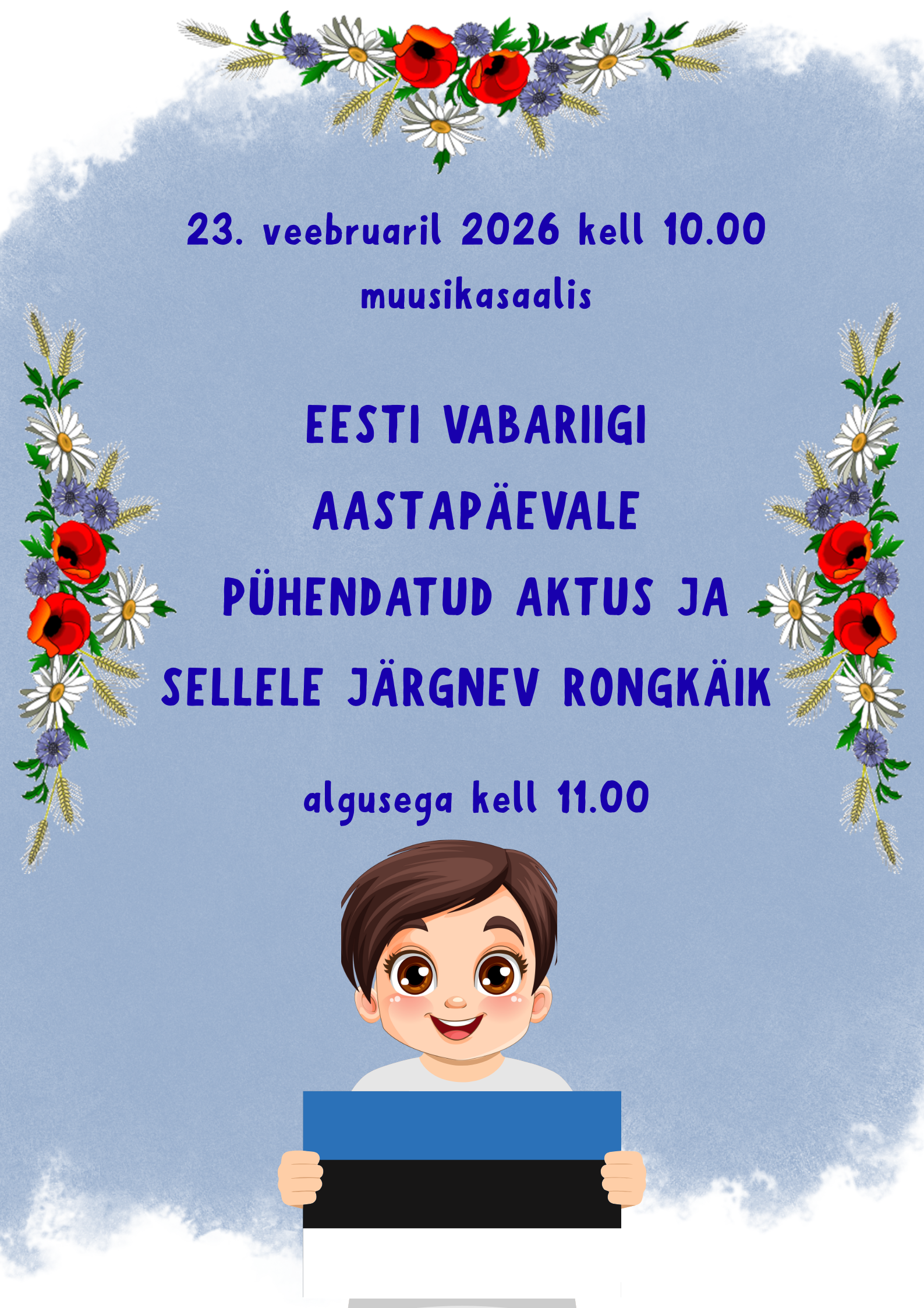 23. veebruaril kell 10 toimub Sindi lasteaia muusikasaalis Vabariigi aastapäevale pühendatud aktus ja sellele järgneb kell 11 rongkäik ümber kvartali. Kaasatud on Tori Vallavalitsus, Naiskodukaitse, Kaitseliit, Sindi Tuletõrje selts, Politsei, Noored Kotkad, lasteaia hoolekogu.