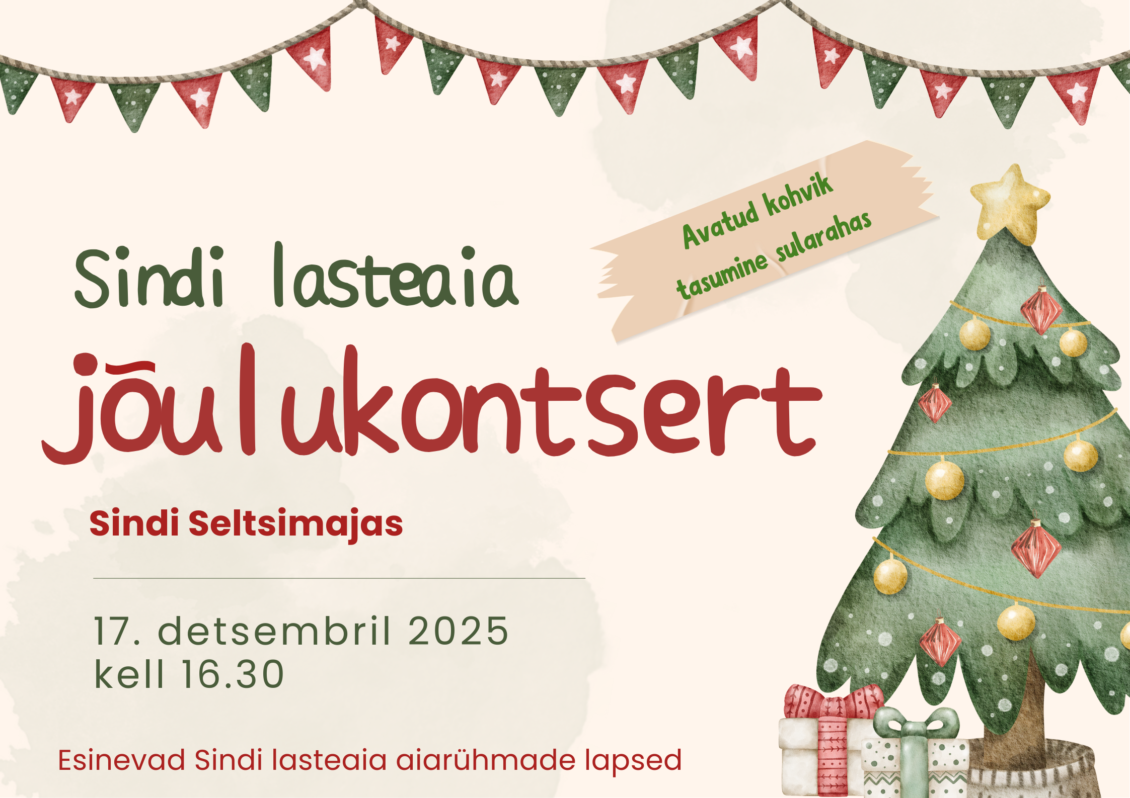 17. detsembril 2025 kell 16.30 toimub Sindi Seltsimajas lasteaia jõulukontsert. Esinevad Sindi lasteaia aiarühmade lapsed.