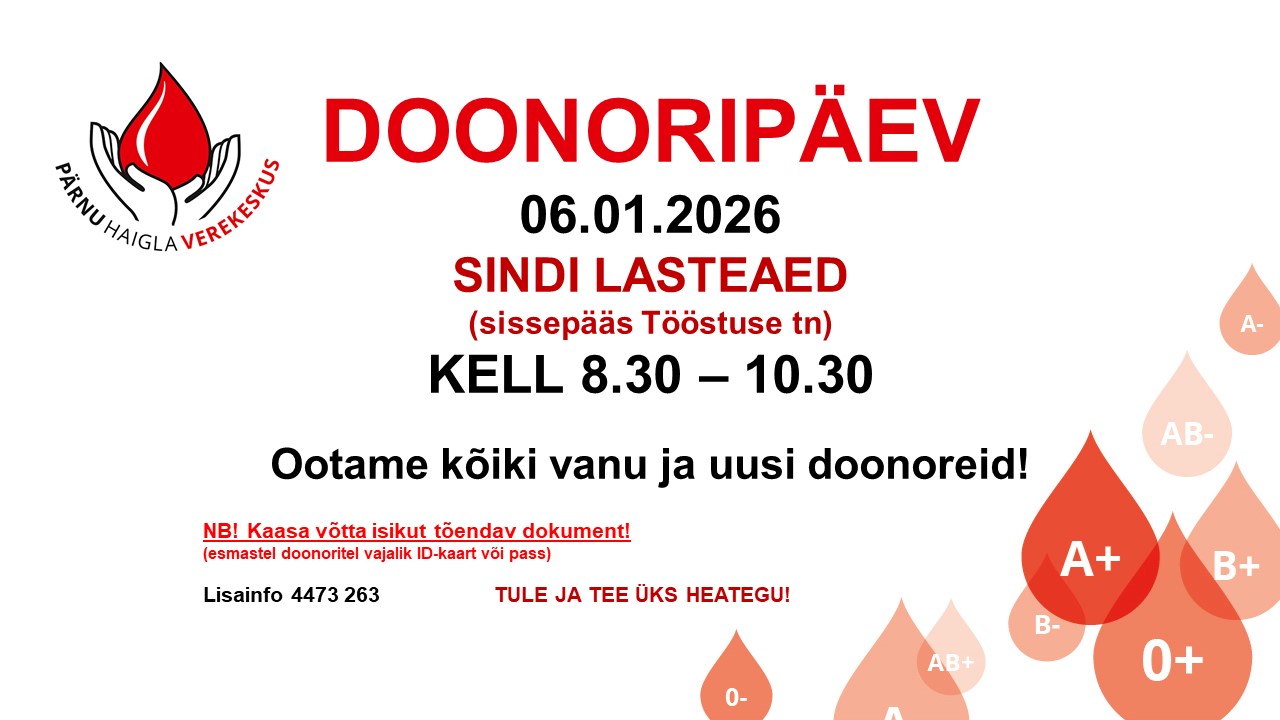 06. jaanuaril 2026 oodatakse taas kõiki uusi ja vanu doonoreid Sindi lasteaia muusikasaali doonoripäevale.